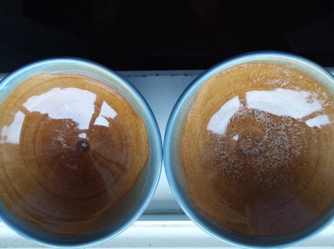 set of blue and tan bowls